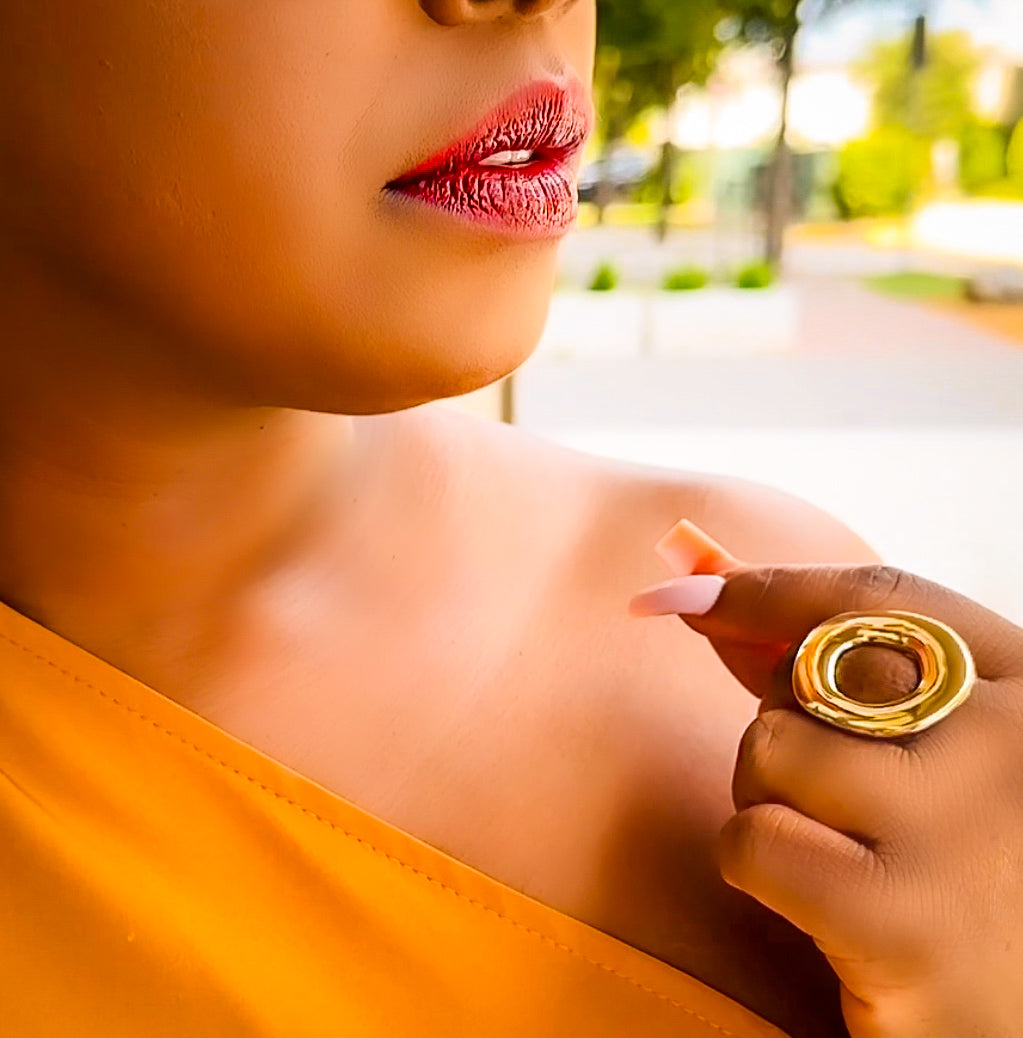 Style tip: Pair the Golden Halo Ring with a chic drape dress or statement kimono for a luxe, head-turning look.