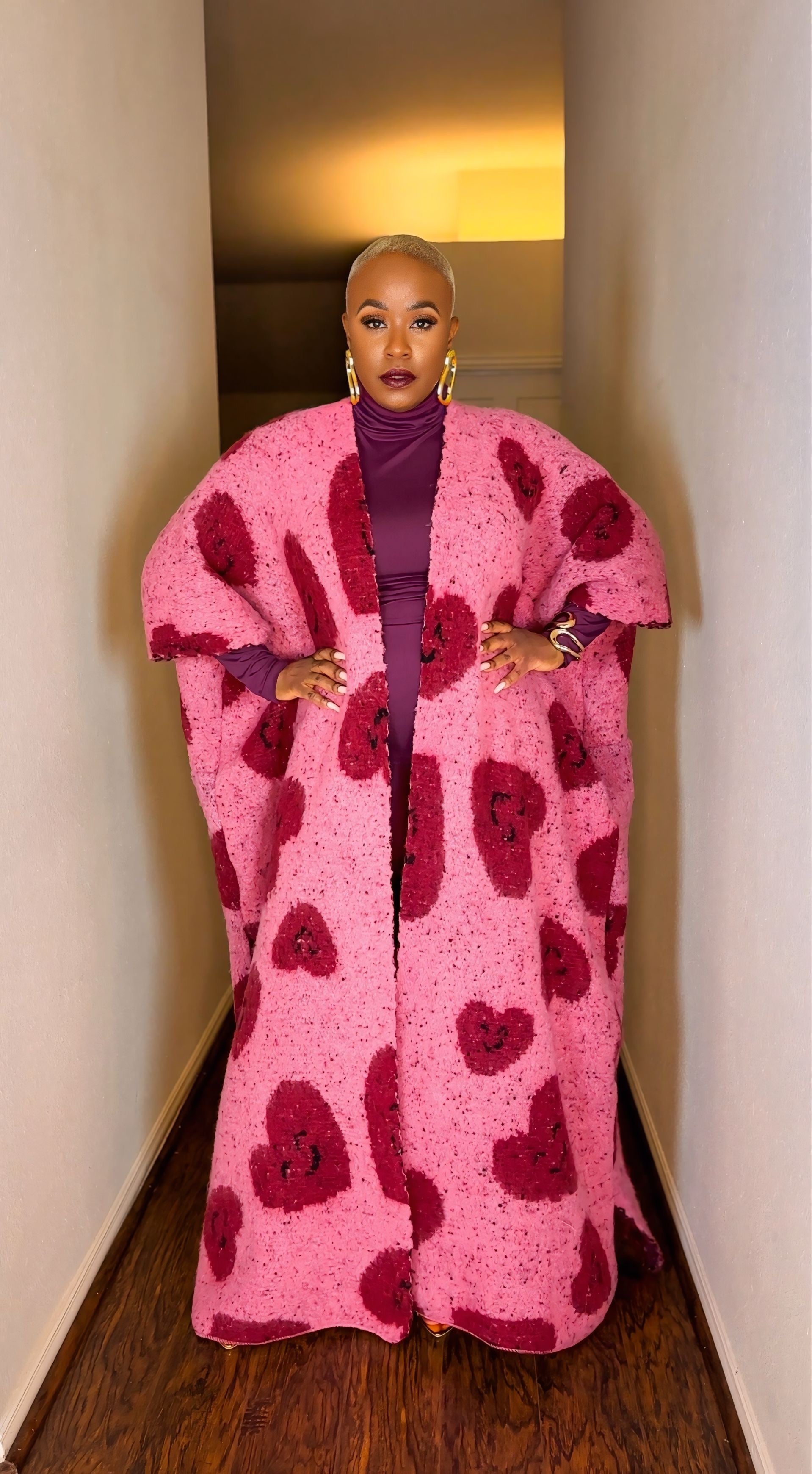 Featuring a plush knit fabric in a bold berry-pink hue with deep wine heart accents, this open-front silhouette drapes beautifully over any look. The relaxed fit and flowy cut make it perfect for pairing with everything from jeans and boots to dresses and heels.