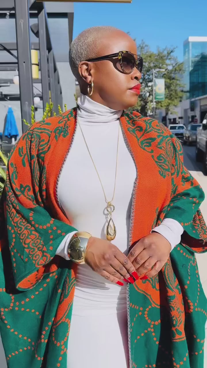 Oversized Open Front Winter Cardigan (Orange/Hunter Green Damask Print)--Will Ship The Week Of 11/10/25