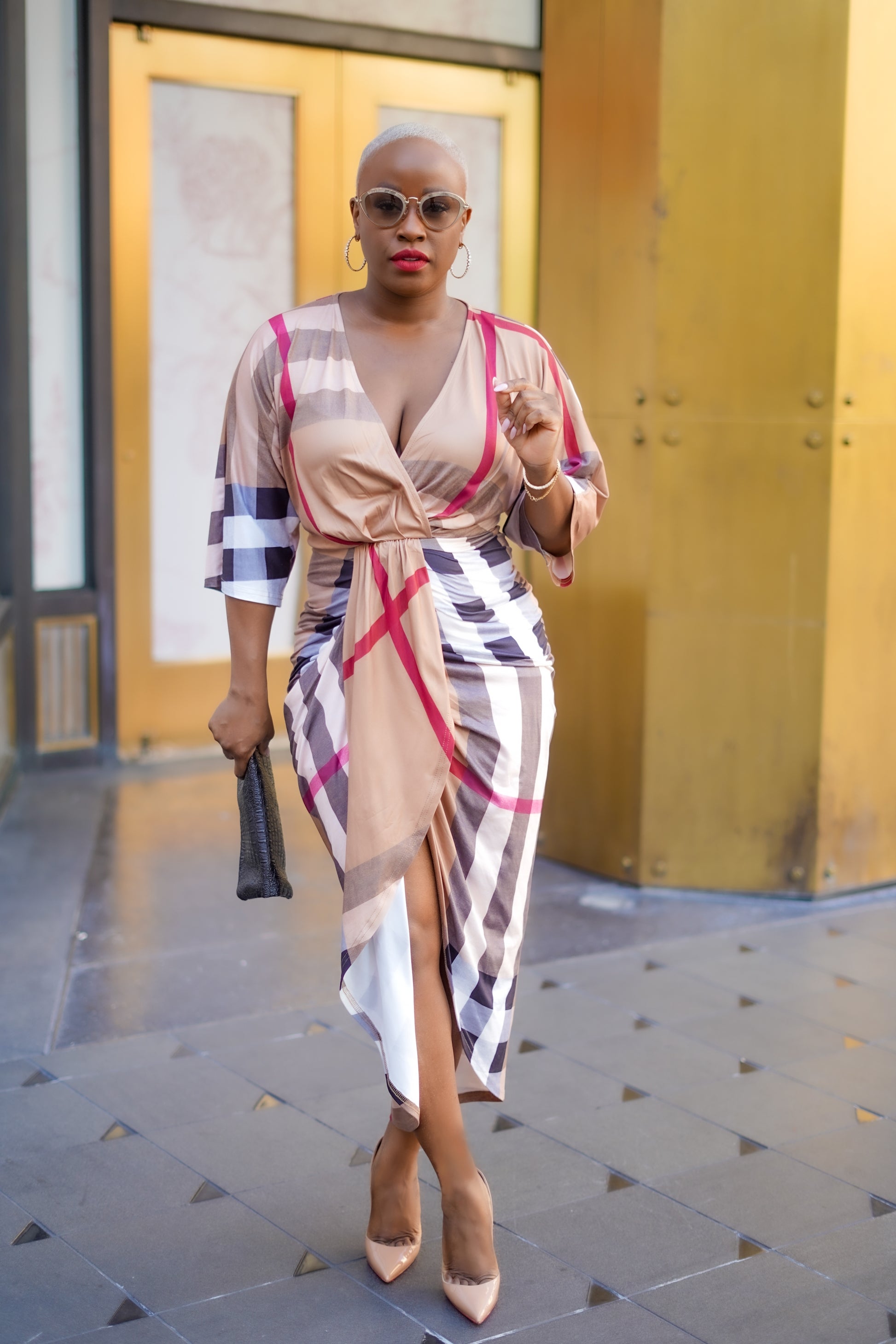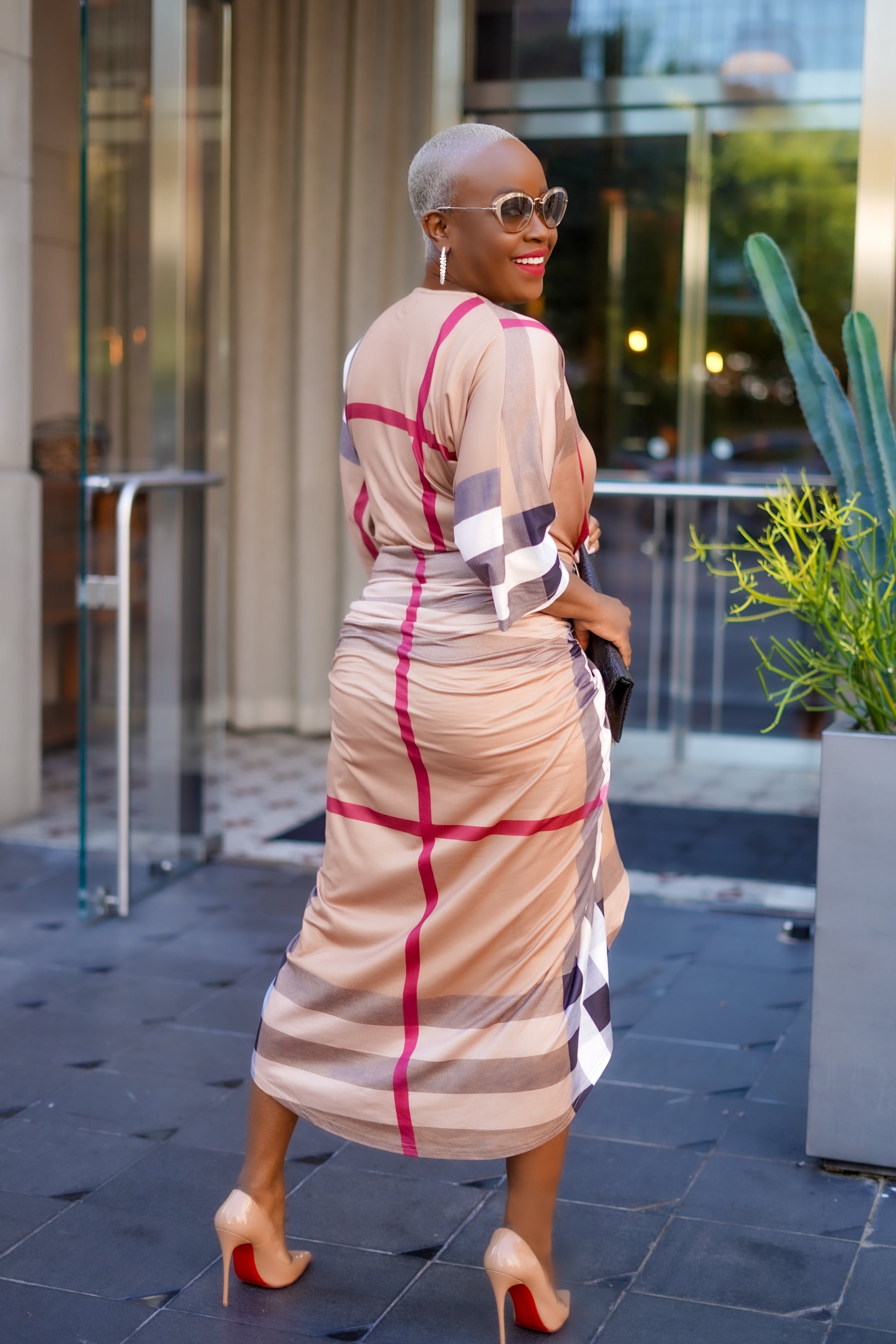 Plaid Print Ruched Knit Bodycon Dress