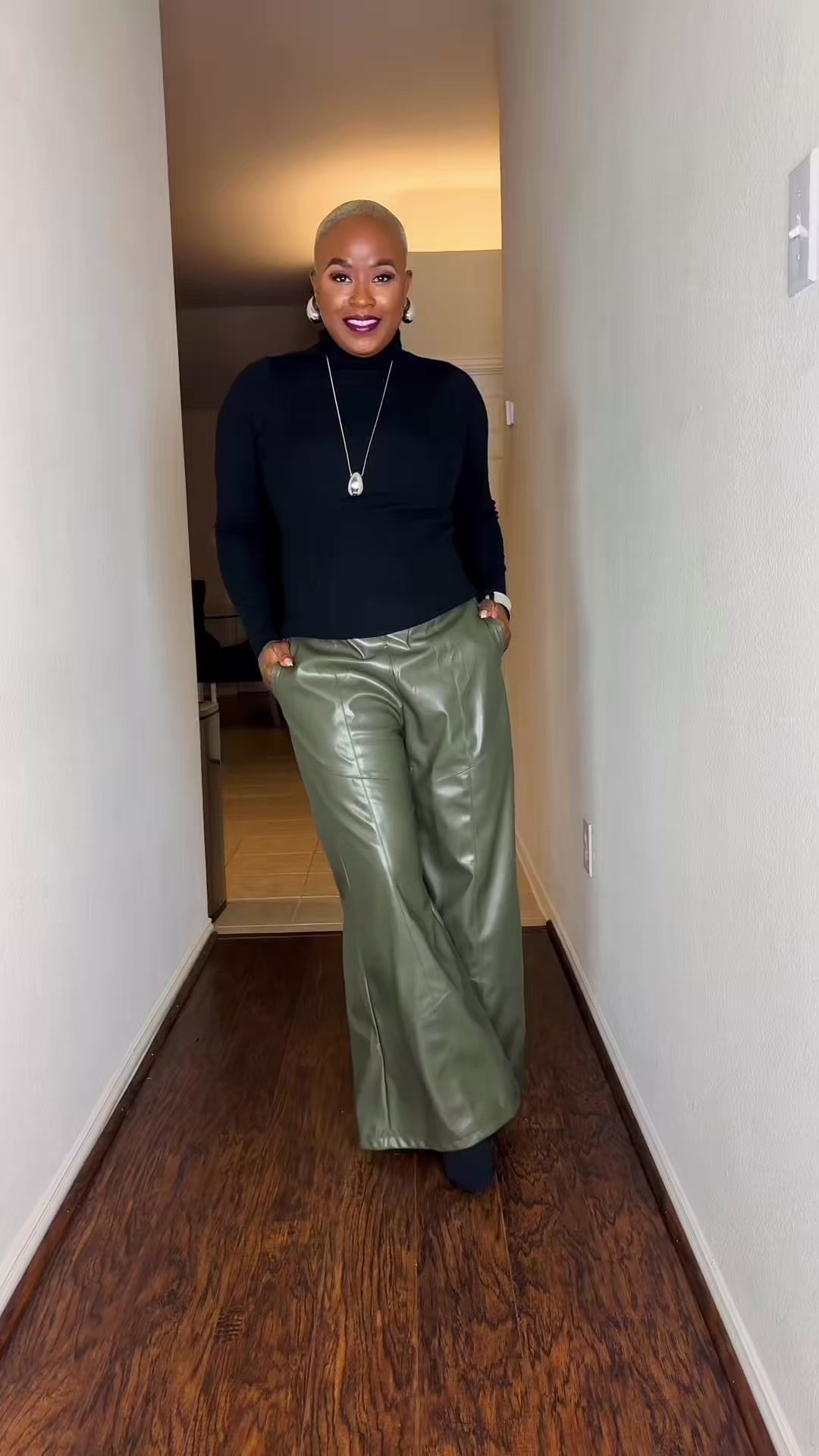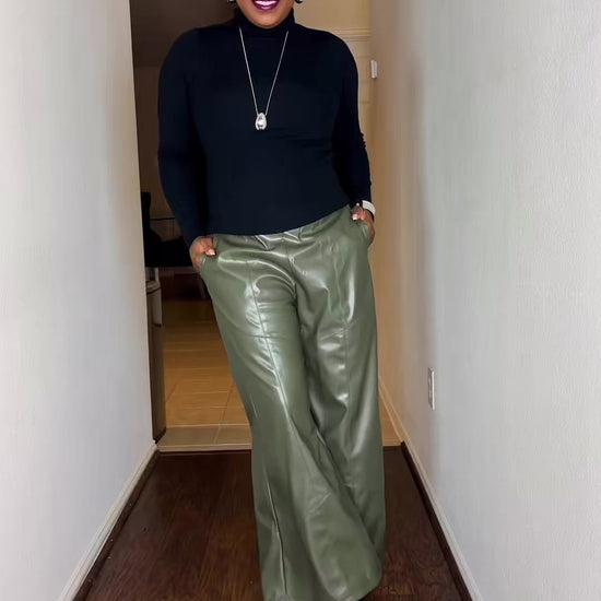 - Set includes black turtleneck top + olive faux leather pants