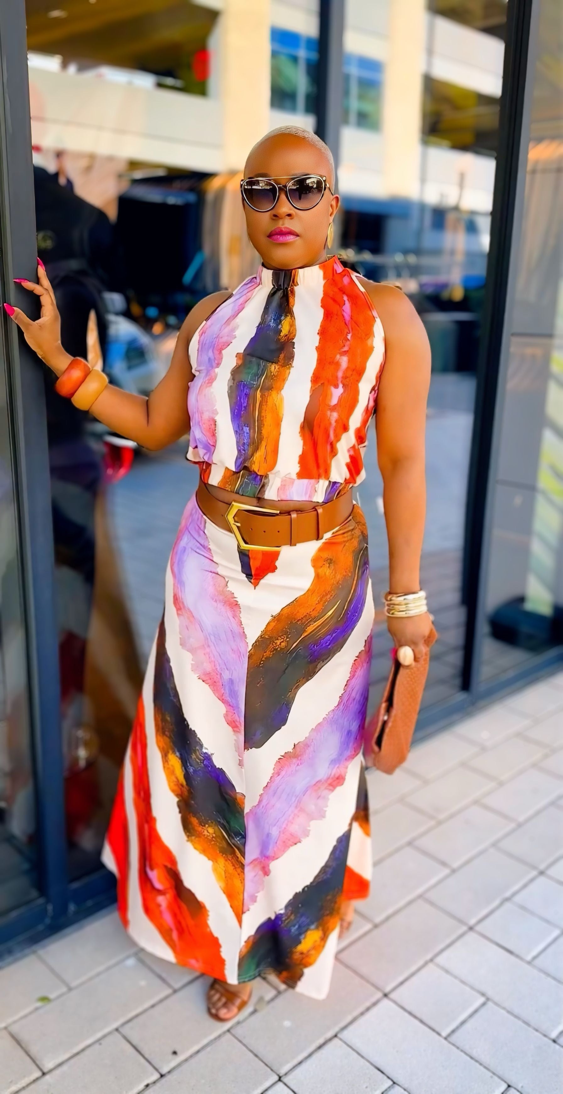 The halter-style top offers a flattering, secure fit while the high-waisted maxi skirt drapes effortlessly along the body, creating an elongated, elegant silhouette. This set is perfect for brunch dates, vacations, rooftop dinners, or any moment that calls for elevated style with ease.