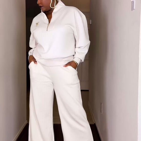 Effortless comfort meets elevated style in this luxe two-piece lounge set. This coordinated look features a scuba half-zip pullover paired with fleece wide-leg sweatpants, creating a soft, monochromatic finish.