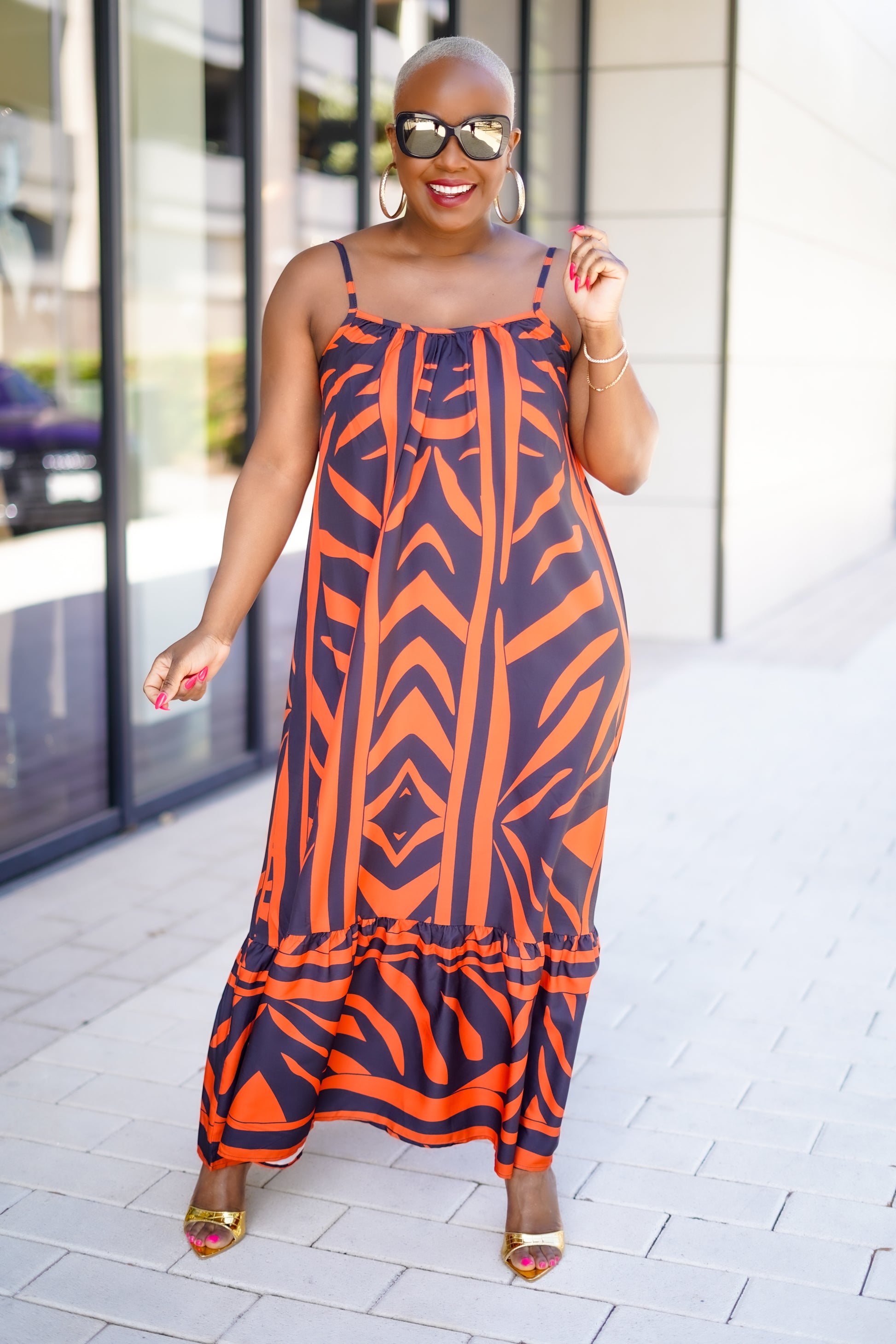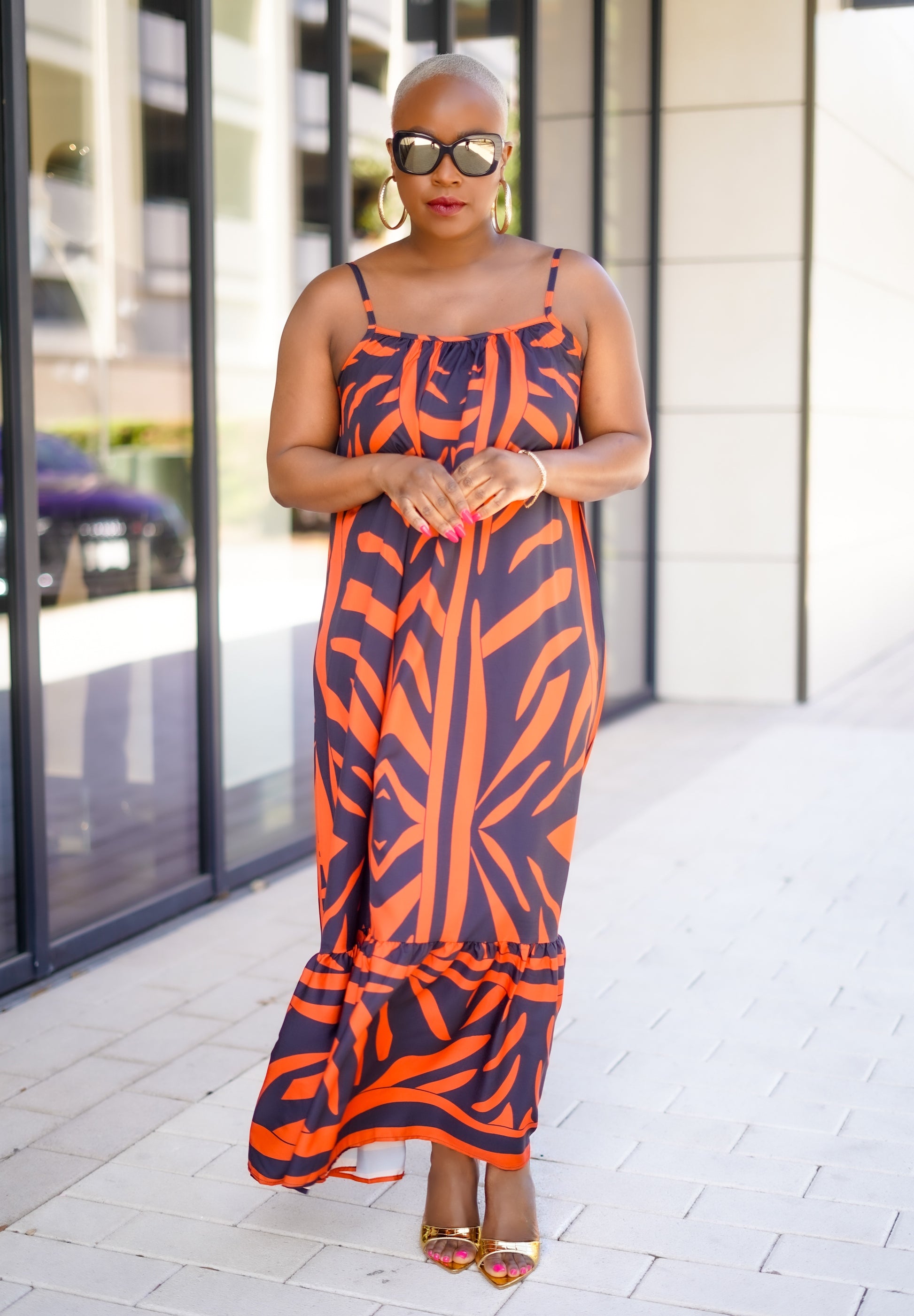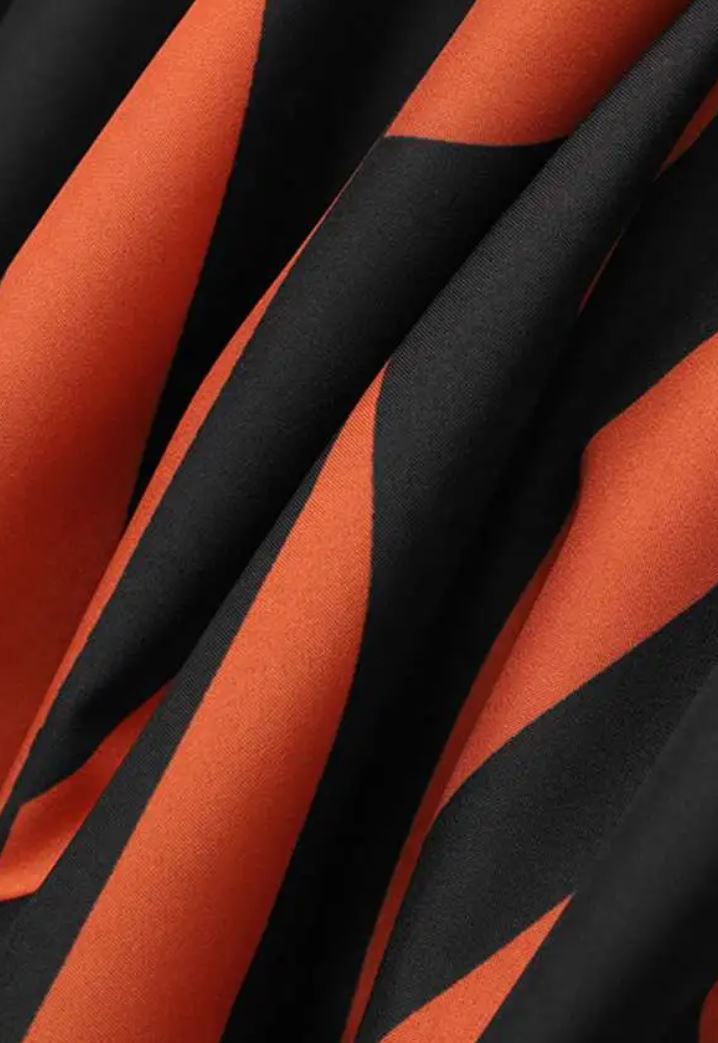 - Although it looks navy and burnt orange in the photo it is actually burnt orange and black print
