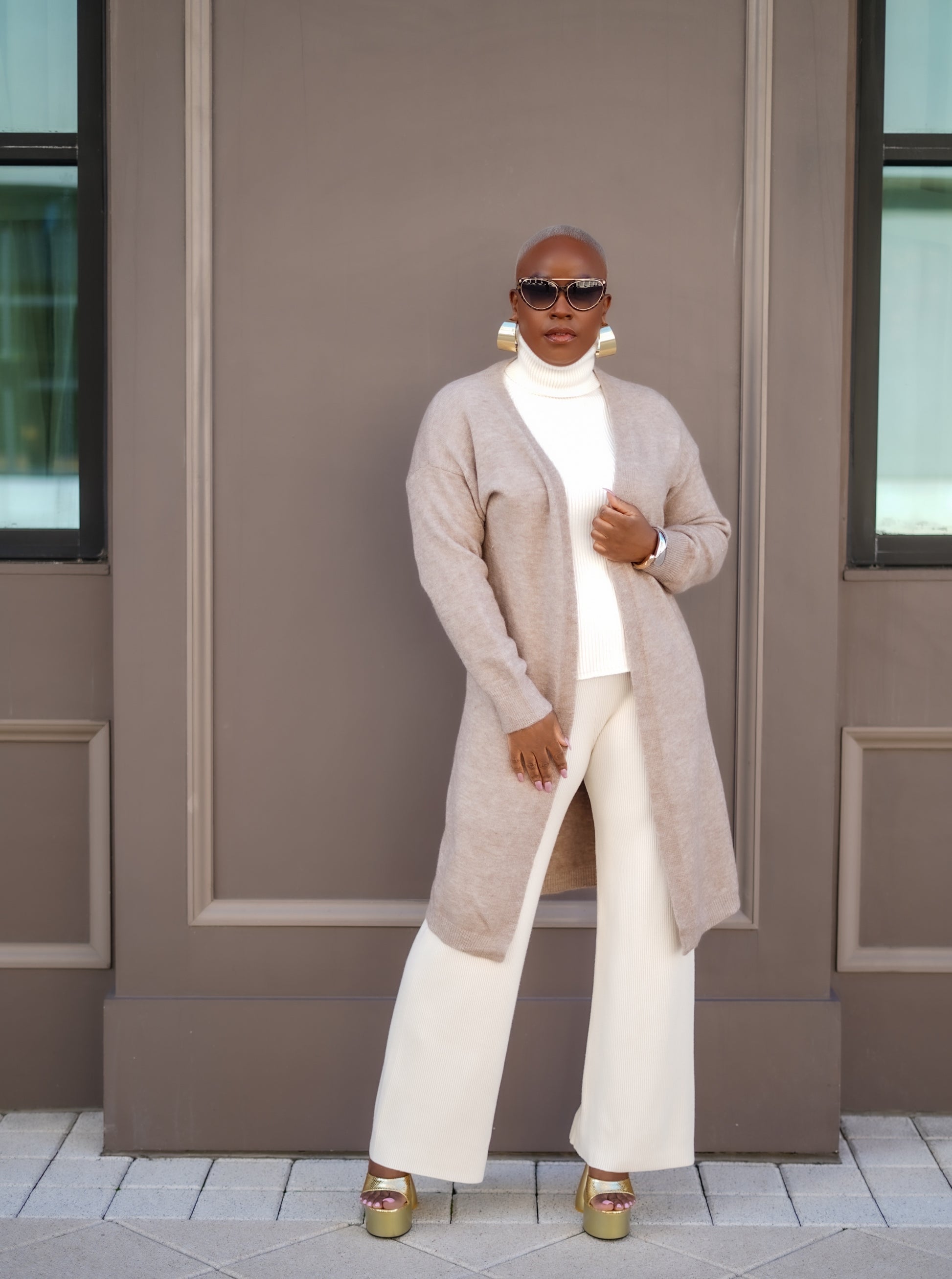 - Set includes: Turtleneck Top, Matching Pants, and Cardigan Sweater
